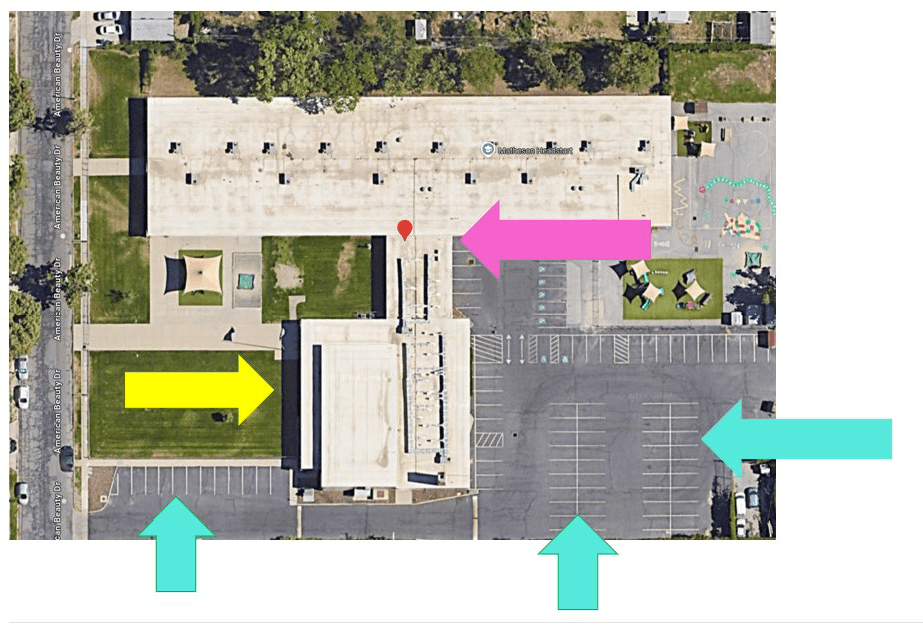 - Guests will enter at the door where the pink arrow is pointing (there is a door on both the east and west facing side of the building. They will sign in and be issued a visitor badge that they will return at the end of the day.